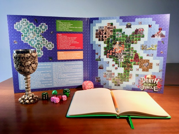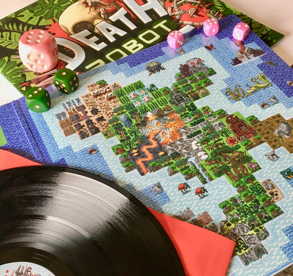 Death Robot Jungle is the first RPG setting in LP format. From the outside, it looks like a regular record. Open it and it doubles up as a GM screen with a minimalist description and a psych-map illustrated by JASON BRADLEY THOMPSON (Hot Springs Island, D&D walkthroughs).